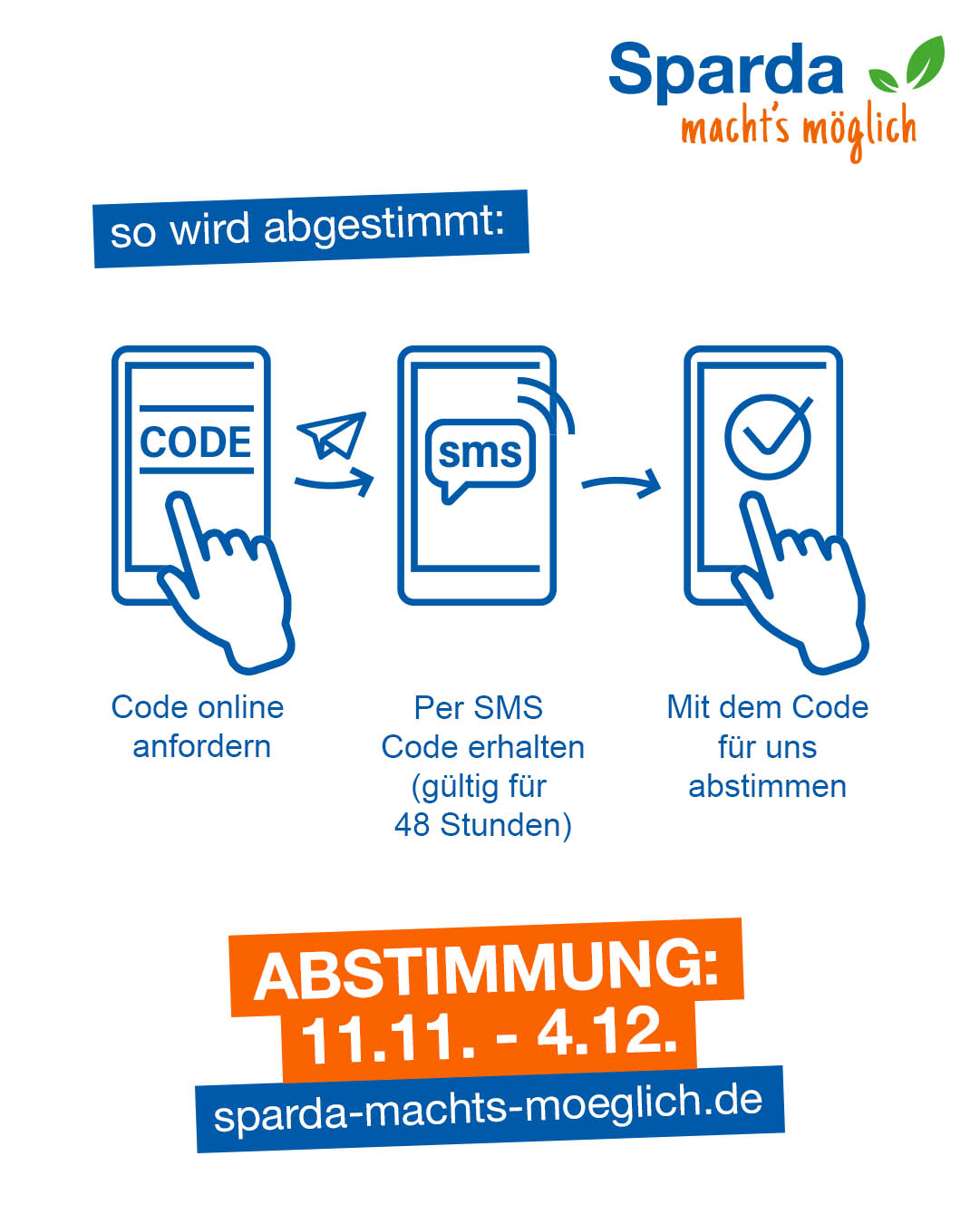 Die Spardabank unterstützt seit vielen Jahren gemeinnützige Gruppen, Vereine, Schulen, Kindergärten und Hilfsorganisationen sowie kulturelle und kommunale Veranstaltungen in der Region. Wir haben uns für einen Förderpreis beworben und Sie können uns Ihre Stimme geben. Ganz einfach: Über den QR-Code oder den direkten Link einloggen, per SMS Code anfordern und mit dem Code für uns abstimmen.