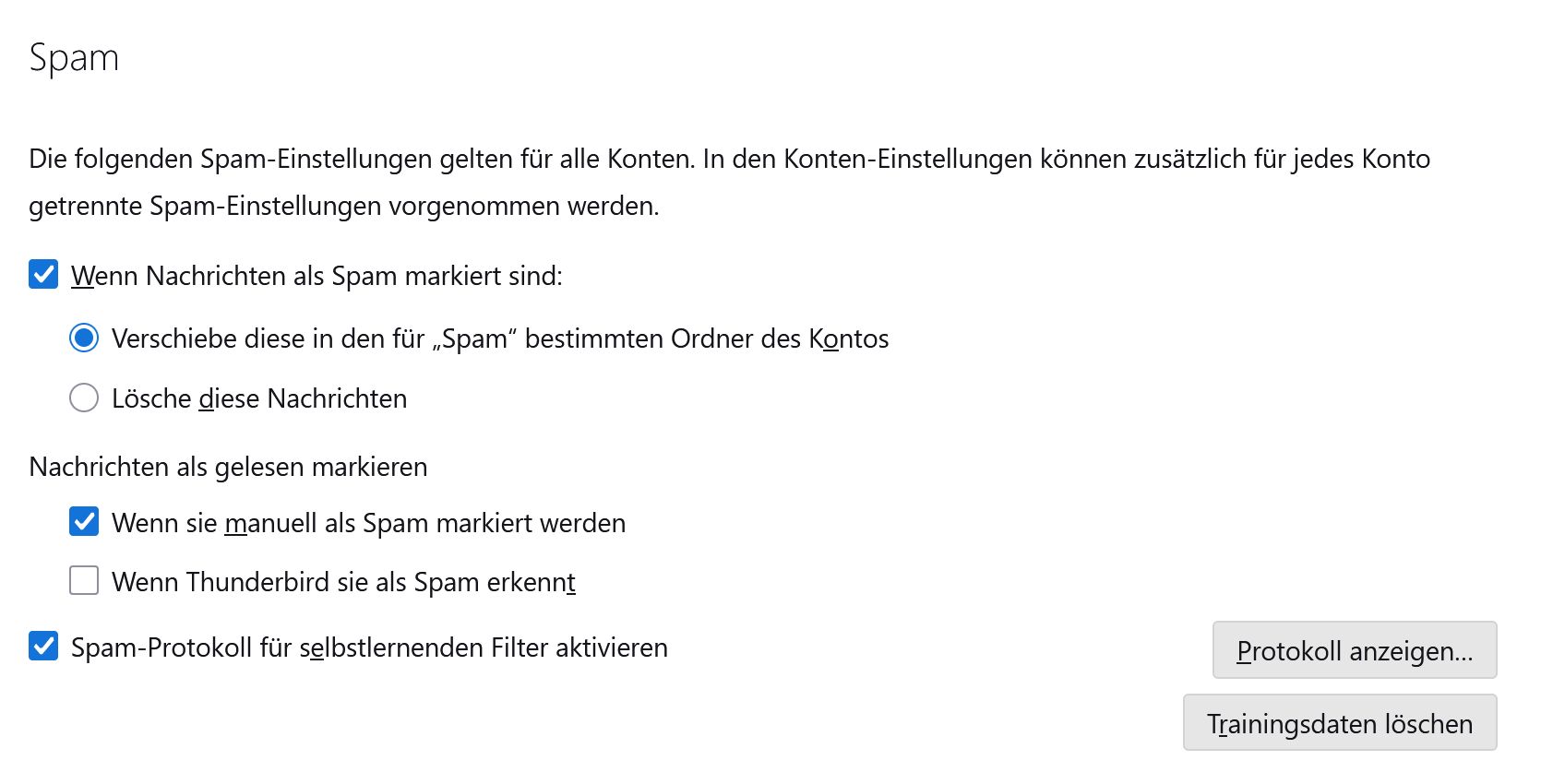 Zuerst den SPAM-Schutz in Thunderbird generell aktivieren und danach jeweils für das verwendete Emailkonto. Falls jemand mehrere Mailkonten in Thunderbird angelegt hat, eben dann für alle Konten einzeln.