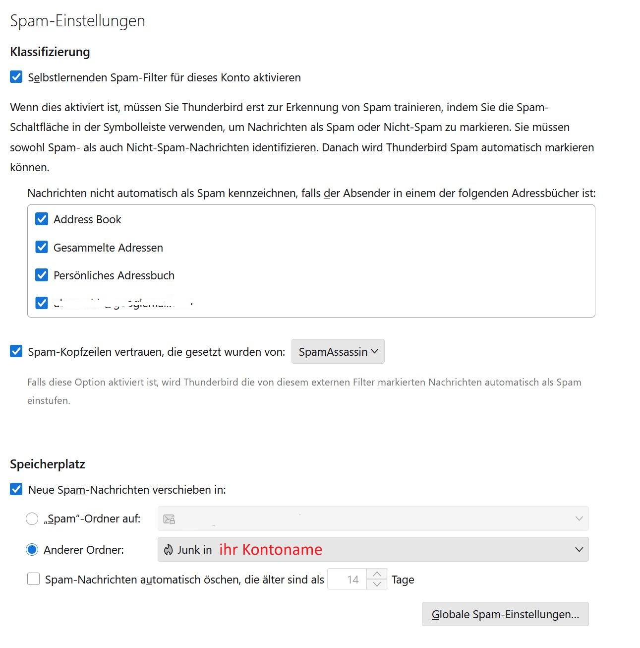 Zuerst den SPAM-Schutz in Thunderbird generell aktivieren und danach jeweils für das verwendete Emailkonto. Falls jemand mehrere Mailkonten in Thunderbird angelegt hat, eben dann für alle Konten einzeln.