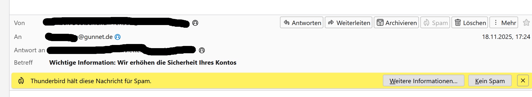 Thunderbird zeigt ihnen dabei an, dass diese Mail als Spam deklariert ist. ..."Thunderbird hält diese Nachricht für Spam" ...