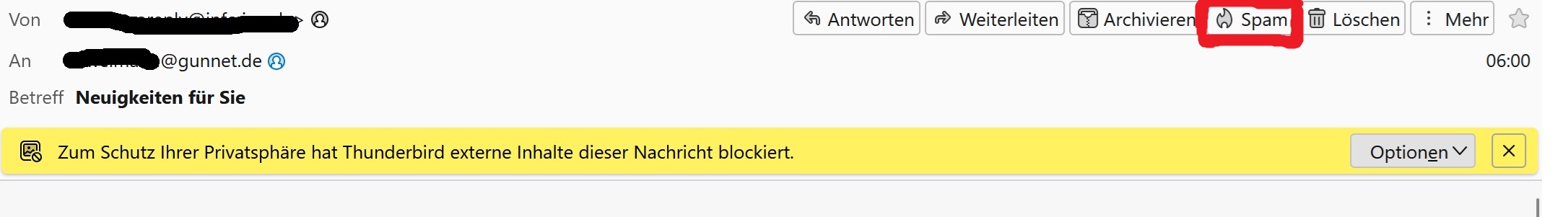 Ist die Mail sicher Spam und Thunderbird hat sie selber nicht als Spam erkannt, gibt es oberhalb der Mail noch einen Button, um diese als Spam zu deklarieren. (siehe nachfolgend rot umrandet)